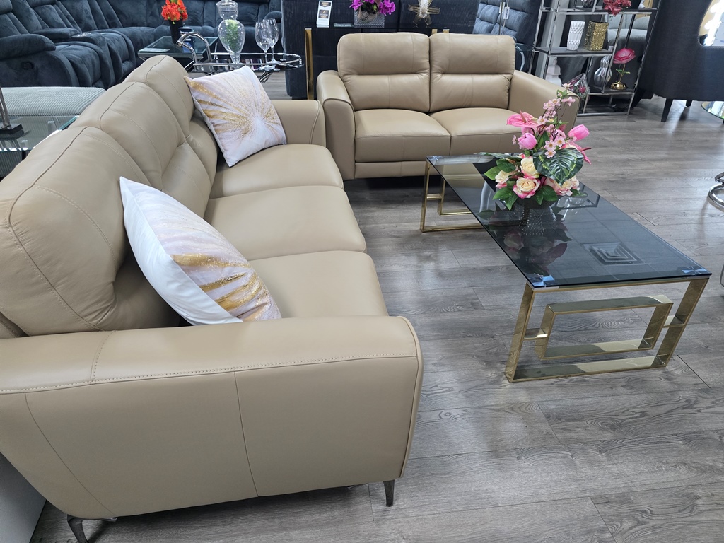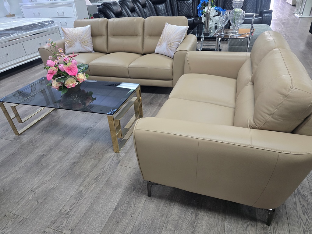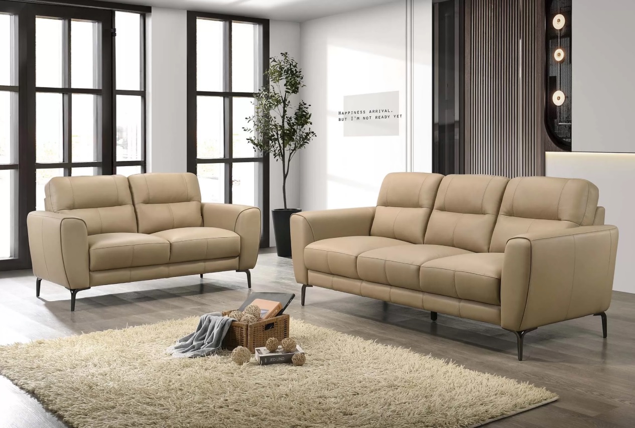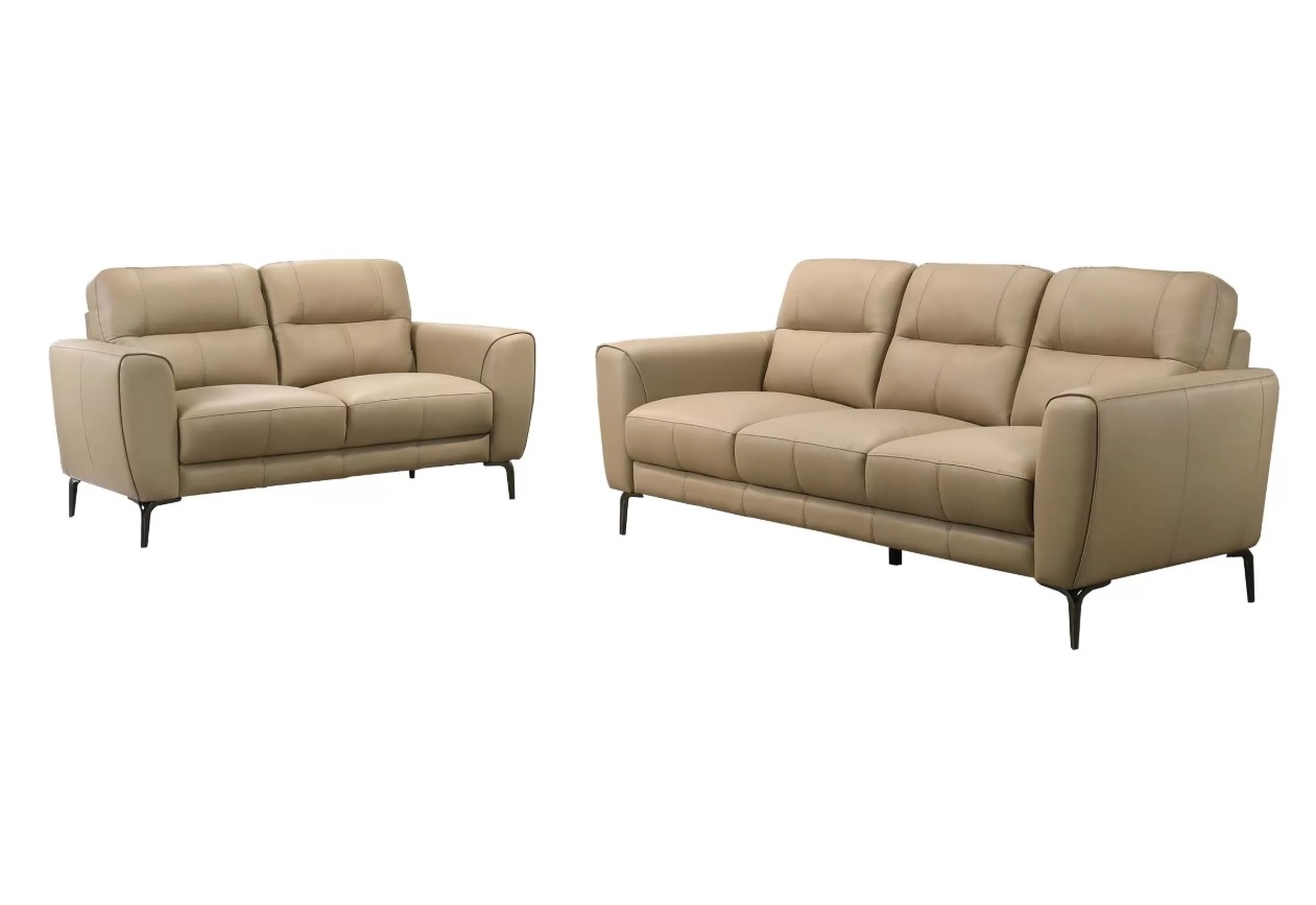 Add modern sophistication to your living room with this beautifully designed 2-Piece Sofa Set, featuring a spacious three-seater sofa and a comfortable two-seater loveseat. Designed for those who appreciate the finer details, this set combines comfort, contemporary flair, and eye-catching craftsmanship to elevate your lounging experience. Each piece features horizontal tufted seat and back cushions that provide just the right balance of support and comfort—perfect for relaxing after a long day or entertaining guests. The armrests are enhanced with subtle lined stitching along the sides, adding a tailored and refined touch that stands out without overwhelming the look. Supporting the sleek frame are modern triangular black chrome legs that deliver both visual appeal and a dependable foundation. Their geometric design adds a sense of movement and flair, giving the entire set a light and stylish presence in your space. Whether used together as a matching set or separately to anchor different areas of your room, this 2-piece collection invites you to unwind in a space where design and relaxation go hand in hand.