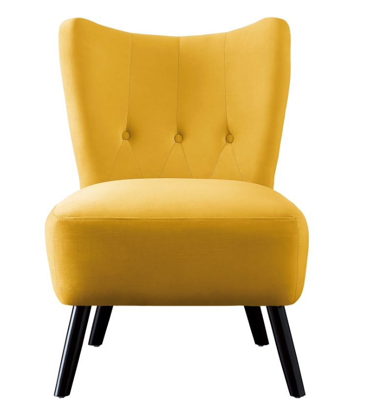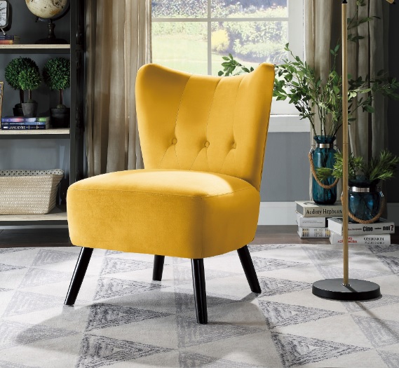 Fun and funky, the Imani Collection will add vibrant accent to your home’s modern décor. The bold yellow velvet covering of this retro-inspired accent chair is sure to draw attention. Dark brown finished wood legs, button accent and contoured shape lend to the unique styling of the collection. Also available in green, red, gray and orange velvet coverings.