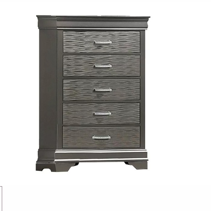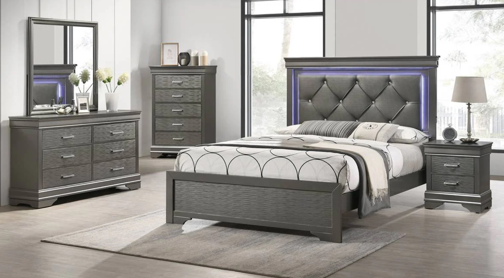 Make every night a luxurious retreat with this exquisite addition to your home. Standing tall, the headboard exudes elegance and sophistication with its diamond, button tufting, adding a touch of timeless charm to your sleep space. As you unwind in the comfort of your bed, immerse yourself in the soft glow of the built-in LED lights, creating a serene ambiance that enhances relaxation. The footboard boasts a unique texture, adding visual interest and character to the ensemble. Complete the look with our matching nightstand, chest, dresser, and mirror, each meticulously crafted to complement the bed’s design. Create a cohesive and harmonious space that reflects your taste and personality.